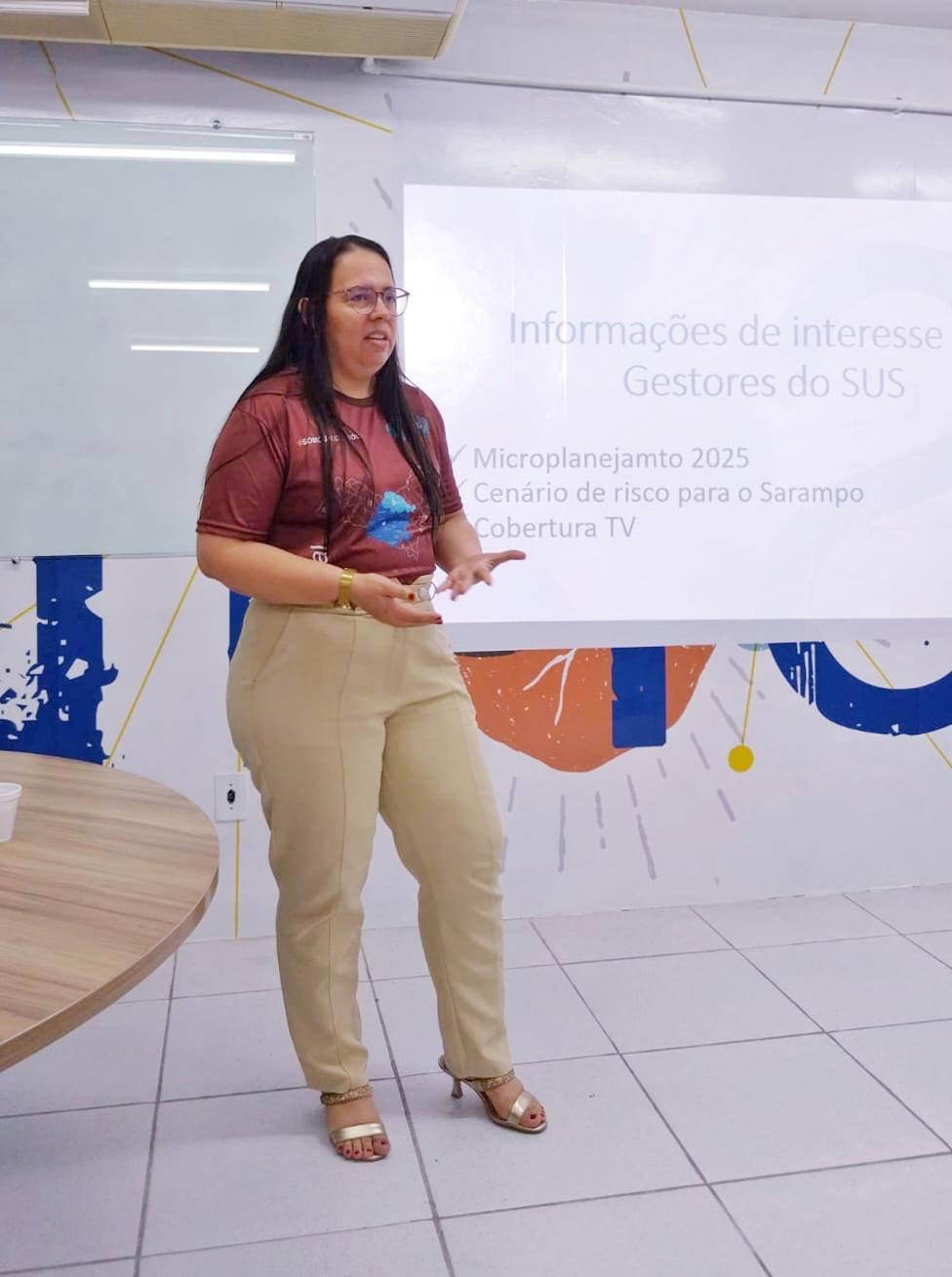 A assessora técnica Kathleen Moura atualizou os diretores sobre o microplanejamento do Programa Nacional de Imunização (PNI) de 2026, cenário de risco para o sarampo e a cobertura da tríplice viral.